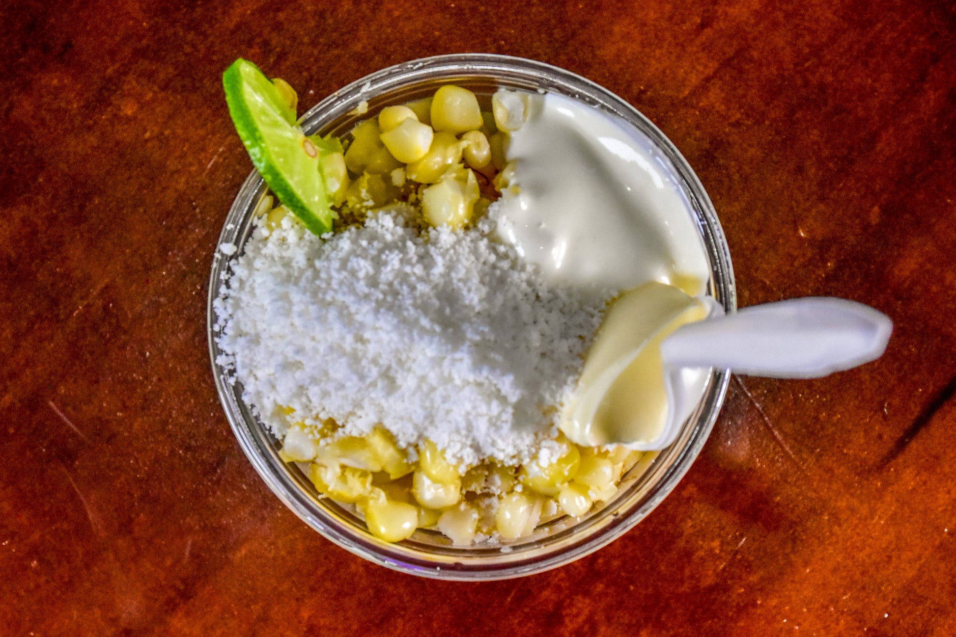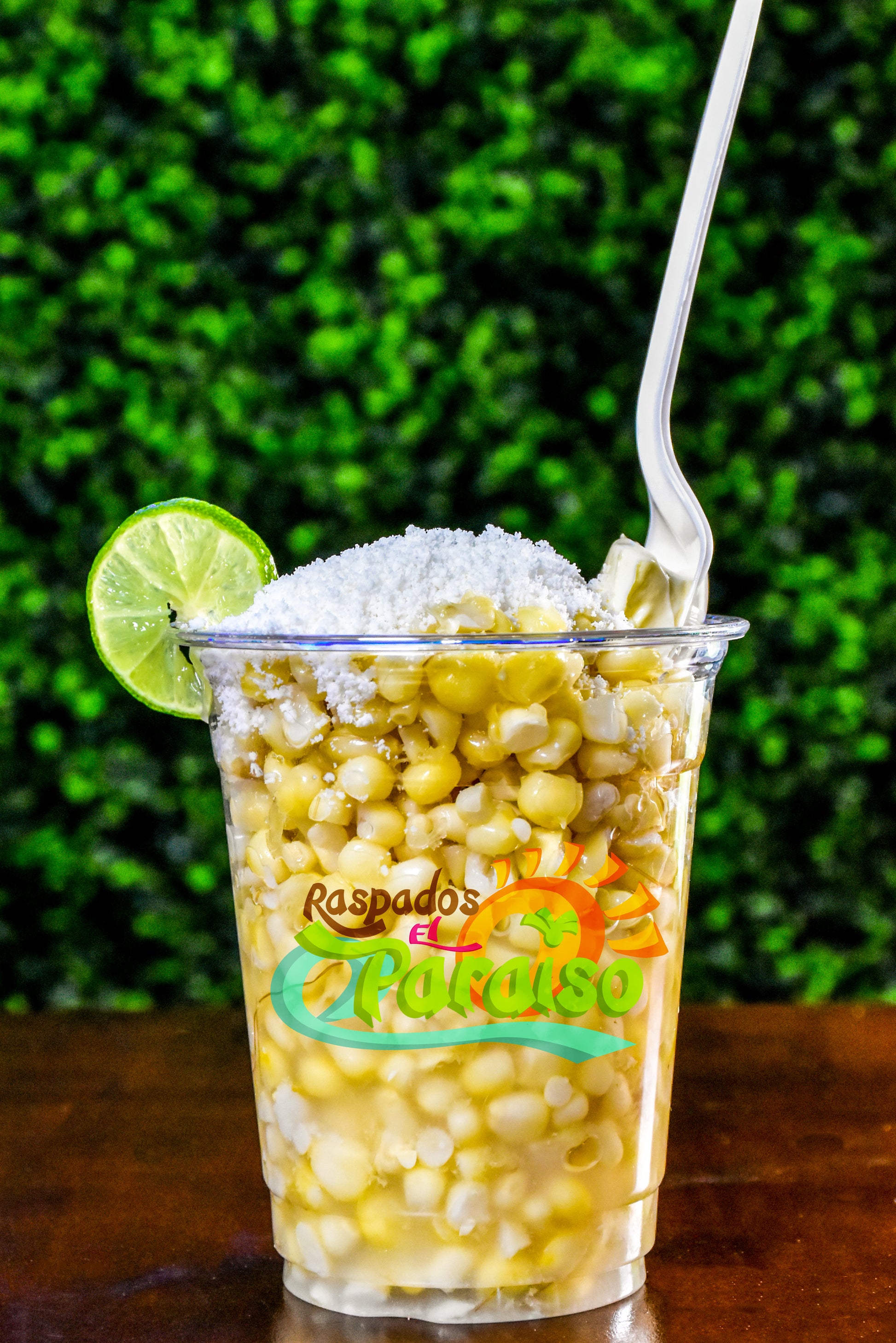 crunched tostitos, rielito, peanuts, jicama, tarugo, cucumber, lime, chamoy, and clamato in a cup