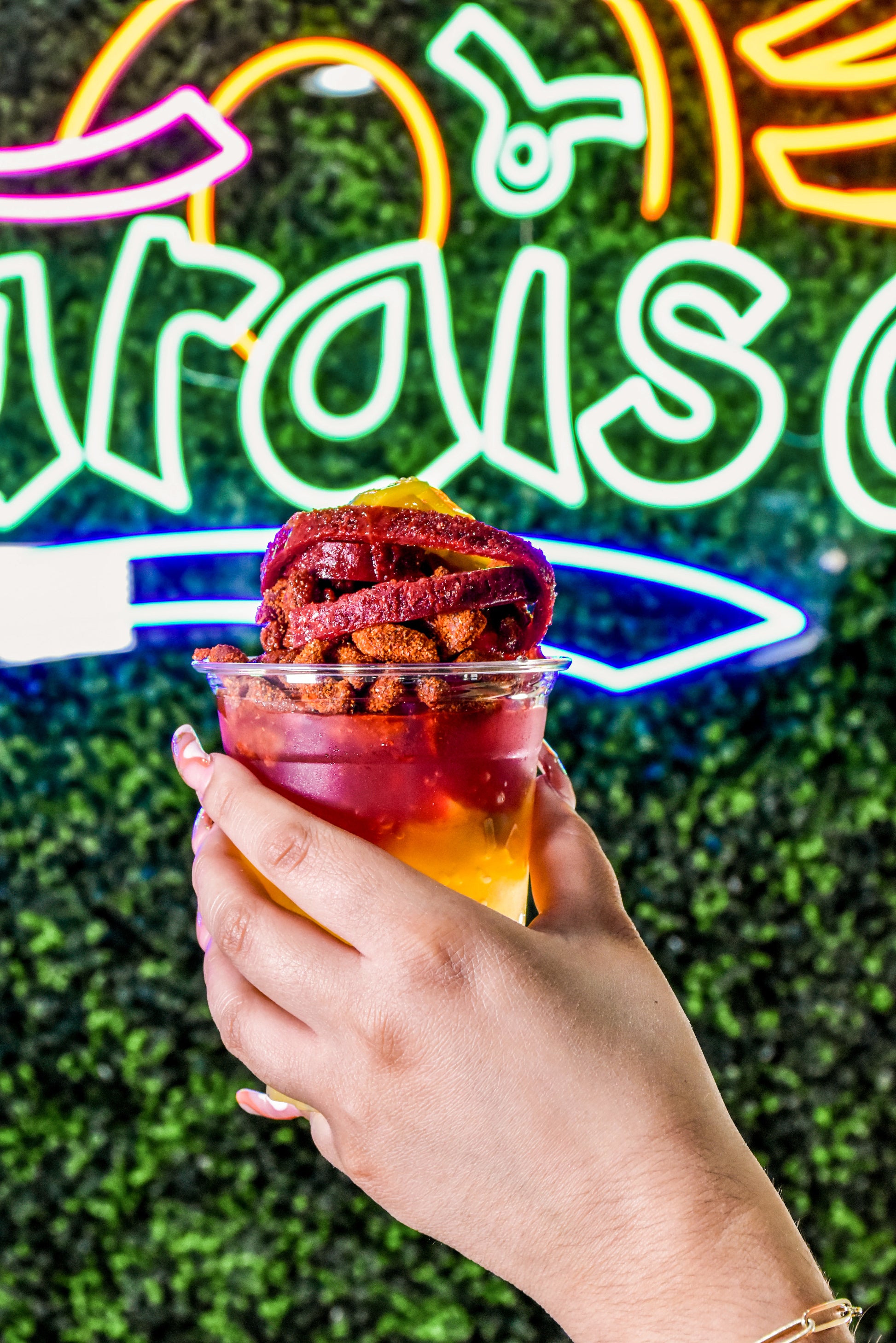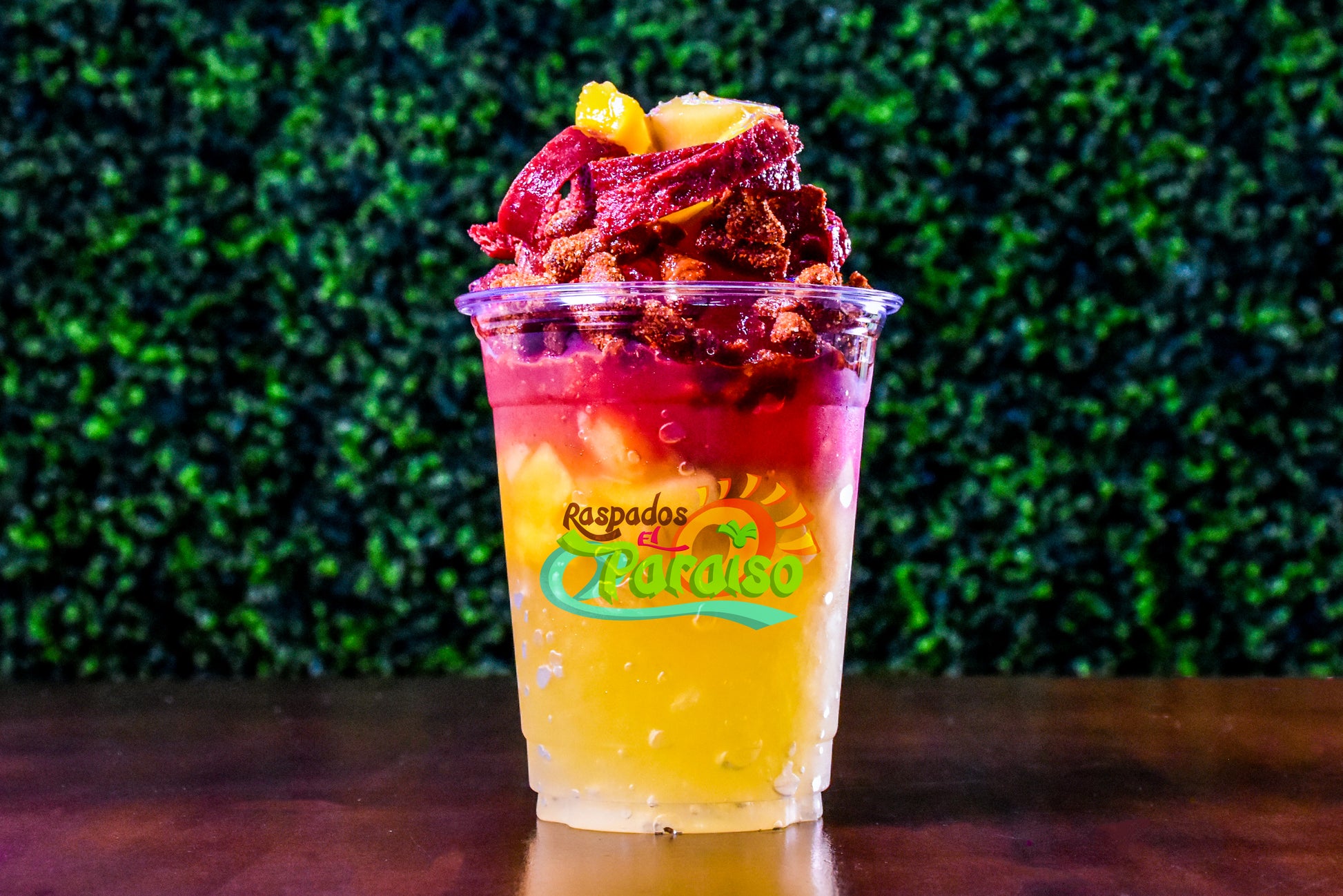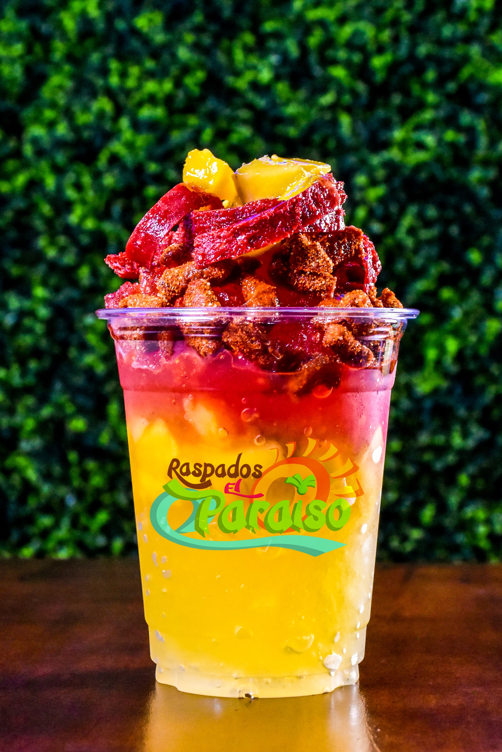 any kind of raspado flavor with rielitos, serpentina, saladito, chamoy and lime