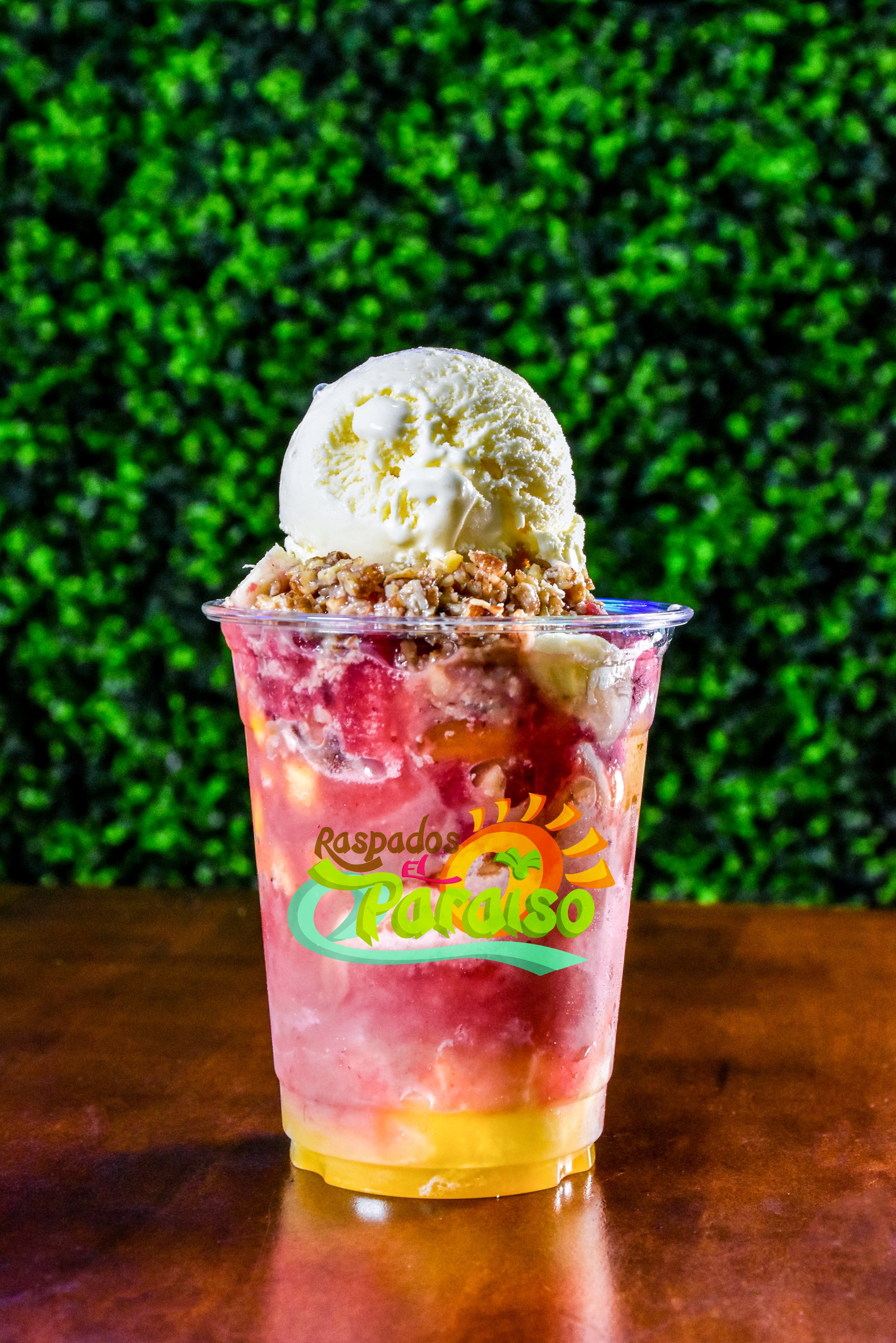 Strawberry, banana, pineapple, peach, pecan with ice cream